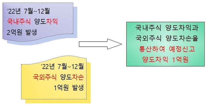 ○ 대주주 A씨는 2022년 하반기에 국내주식을 양도하여 2월 예정보고기간 내에 양도차익 2억원, 해외주식(해외주식)으로 국내주식 양도손실 1억원 발생 2023년 ○ 해외주식(해외주식) 양도차익 합산, 1억원 신고 양도차익 재무제표 신고 및 납입 후, – 국내외 주식의 양도차익을 합산하고, 5월 최종 반납 기간에 신고합니다.주식에 대한 양도소득세는 미지급 또는 미지급되어 가산세와 같은 과태료가 부과될 수 있습니다.